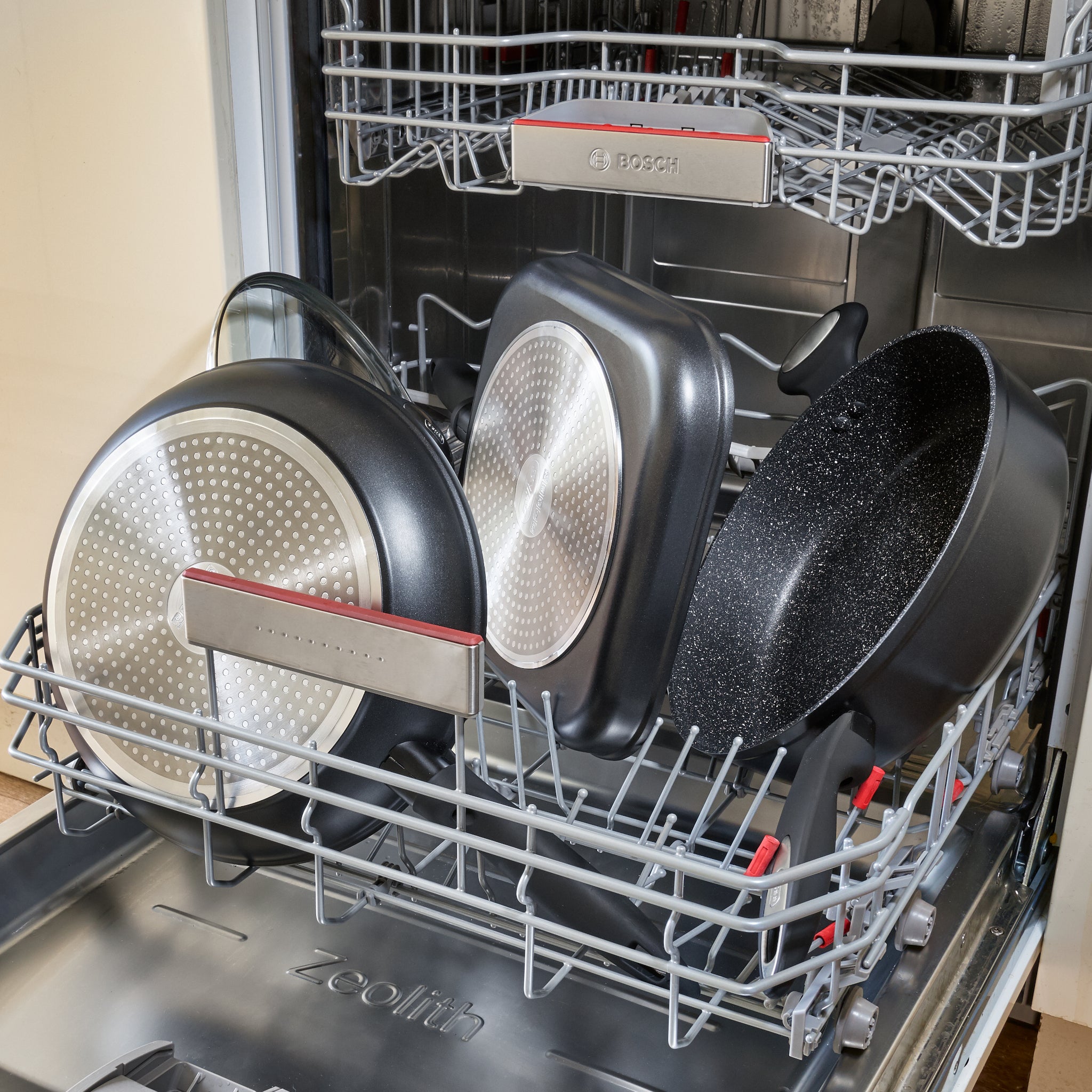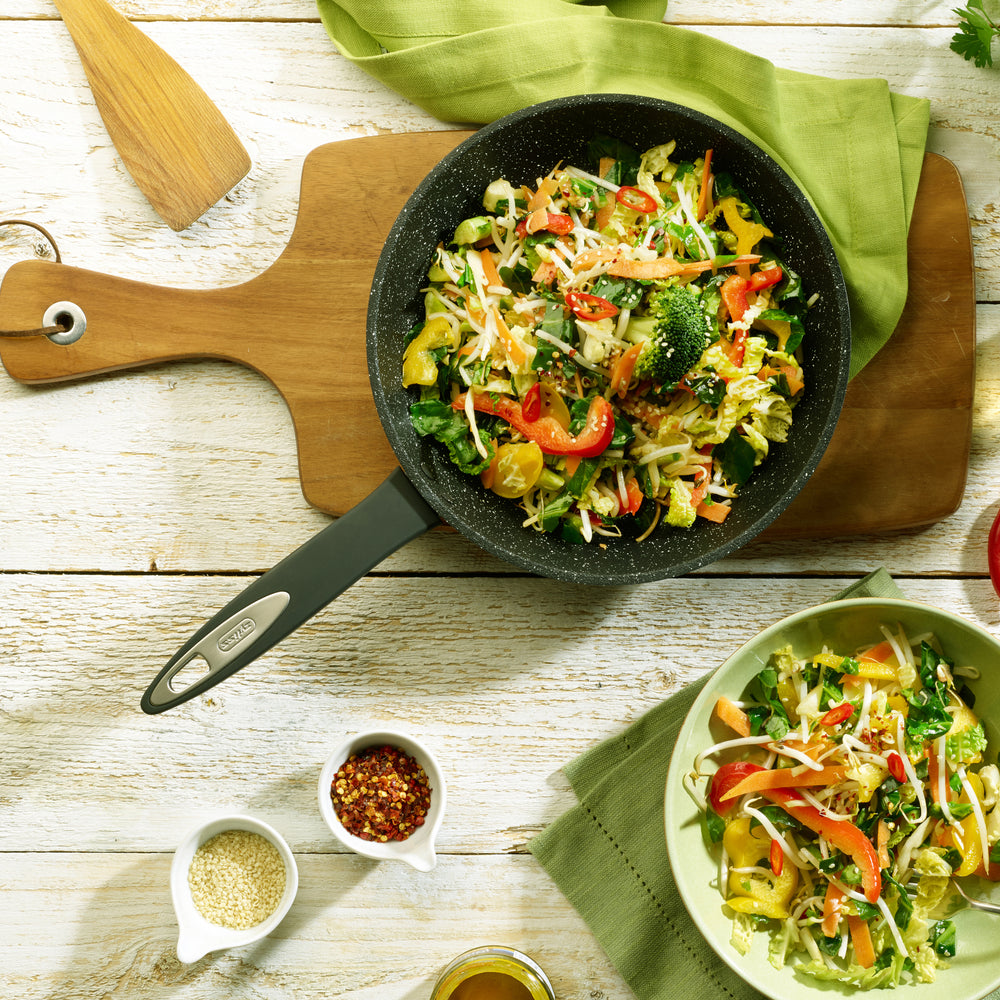 Crafted from forged aluminium, these pans provide fast and even heat distribution, while the scratch-resistant surface is metal tool safe for worry-free cooking. The ergonomic soft-touch handle offers a secure grip, even when wet.