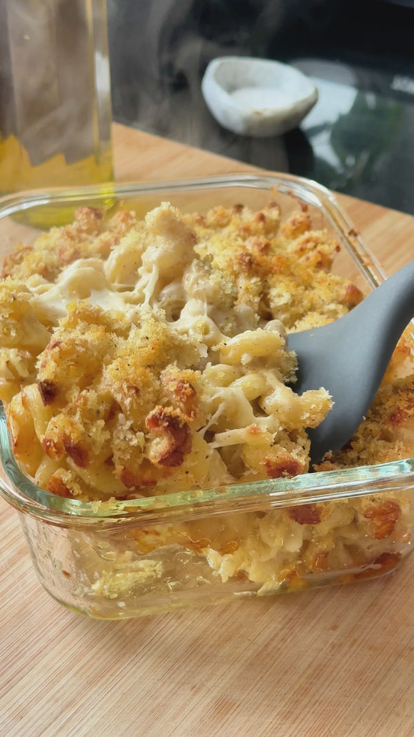- A dash of truffle oil, a little pepper and breadcrumbs mixed together for topping
