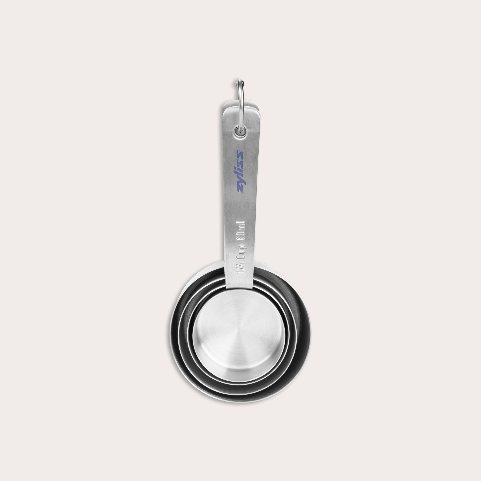 The Zyliss Stainless Steel Measuring Cups provide precision and durability for accurate ingredient measuring in cooking and baking. This stackable set includes ¼ cup (60ml), ⅓ cup (80ml), ½ cup (125ml), and 1 cup (250ml), ensuring versatility for all your recipe needs.