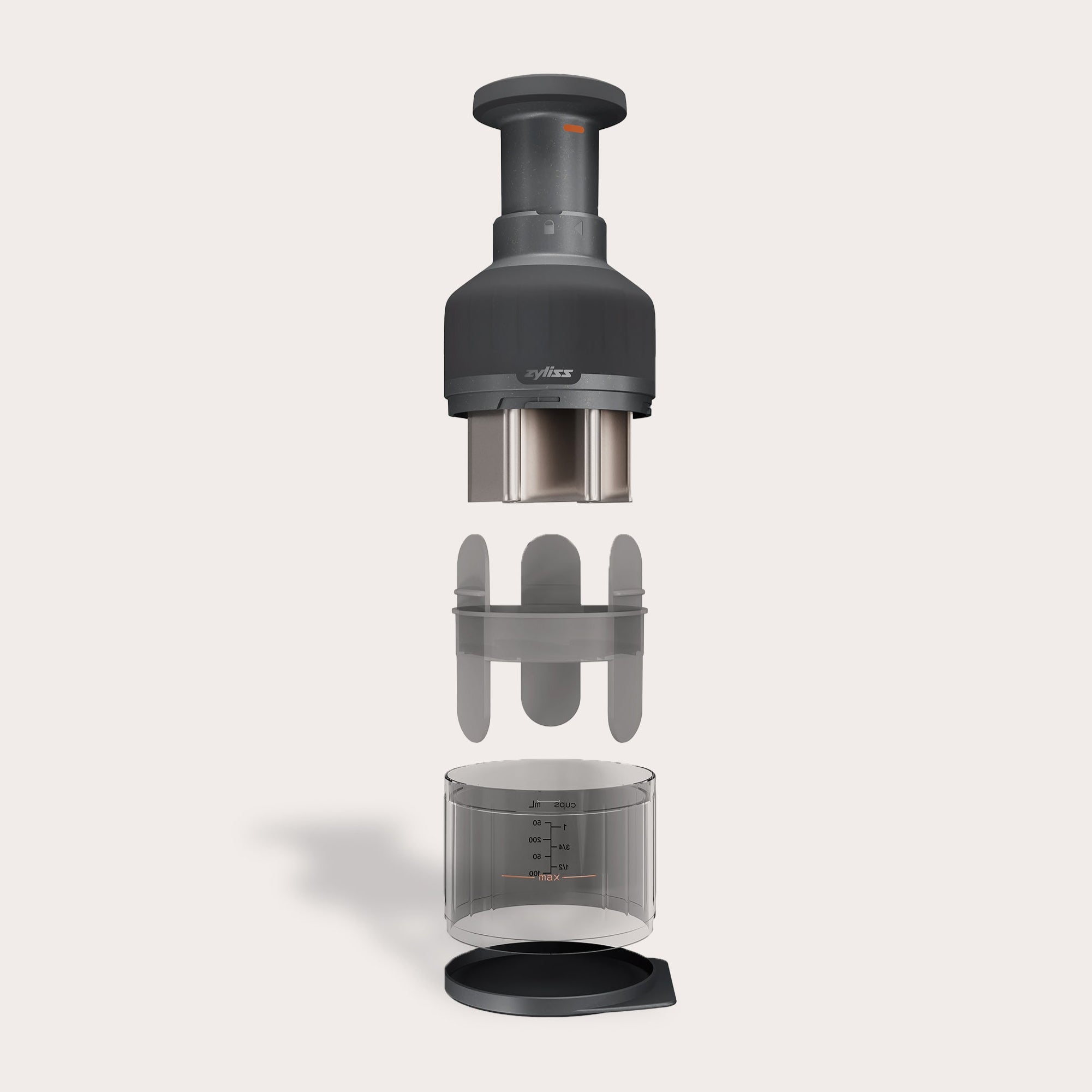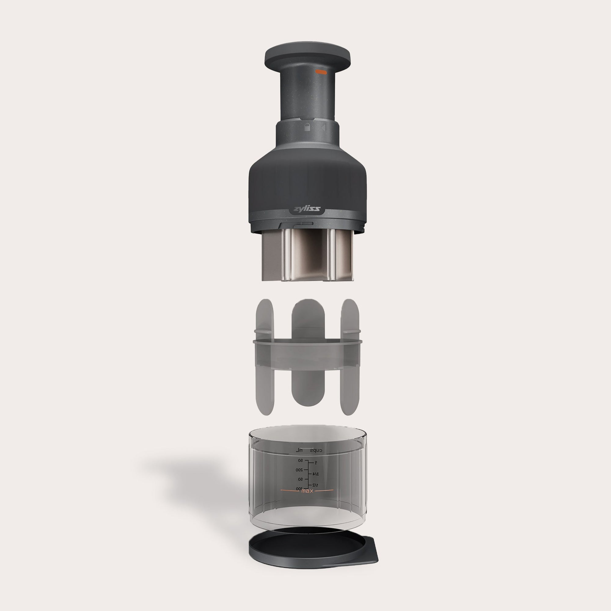 The Zyliss Zick Zick 3 Food Chopper makes chopping quick and effortless. Its sharp stainless steel blade rotates with every press, delivering smooth, even cuts for vegetables, fruits, nuts, herbs, cheese, and chocolate. The plunger extends and rotates wiper blades for consistent results with minimal effort. Chop directly into the built-in container with measurement markings, or remove the base for cutting board use. Designed for comfort, it provides a secure grip and total control. Cleaning is easy - the blade, wiper, and container are all dishwasher safe. With a simple twist, it locks for compact storage. From fresh salsa to finely chopped chocolate, this versatile chopper is built for daily use.