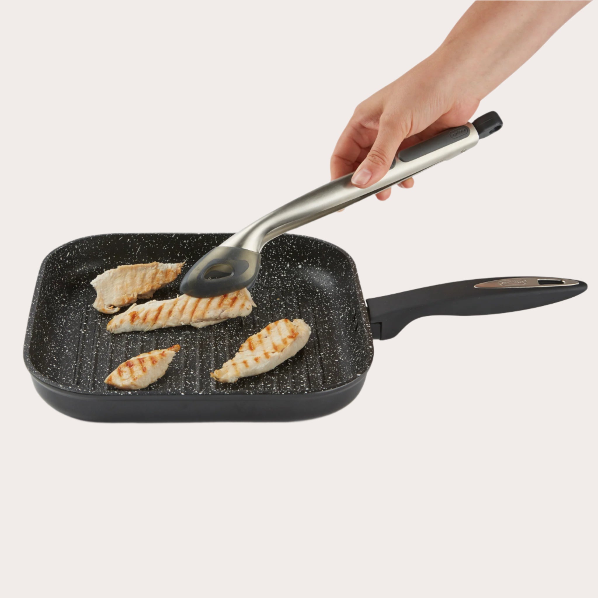 The Zyliss Silicone-Tipped Tongs are ideal for cooking, stirring and serving! Designed for one-handed use, these silicone-tipped tongs lock with a slide of the button located on the side of tool. Silicone tips are heat resistant up to 240C / 464F and won't scratch cookware with non-stick surfaces.