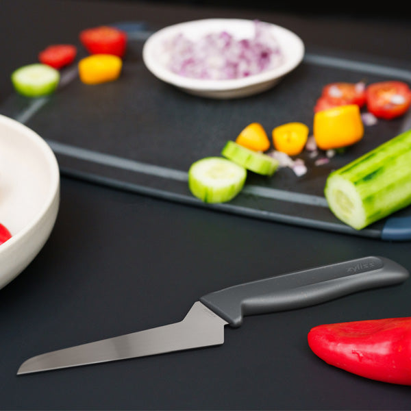 The Zyliss Offset Knife is a versatile tool tailored for precision in small cutting, dicing, and peeling tasks. Its straight blade and uniquely offset handle provide exceptional comfort by lifting fingers off the work surface, reminiscent of the ergonomic feel of a large santoku knife in a compact design. Crafted with an eco-friendly handle using wheat straw material, it reduces plastic usage by up to 20%. This knife is not only food-safe and dishwasher-safe but also includes an easy-insert blade guard for secure storage. With a 5-year Zyliss guarantee, it combines efficiency and sustainability, making it an essential addition to any kitchen toolkit.