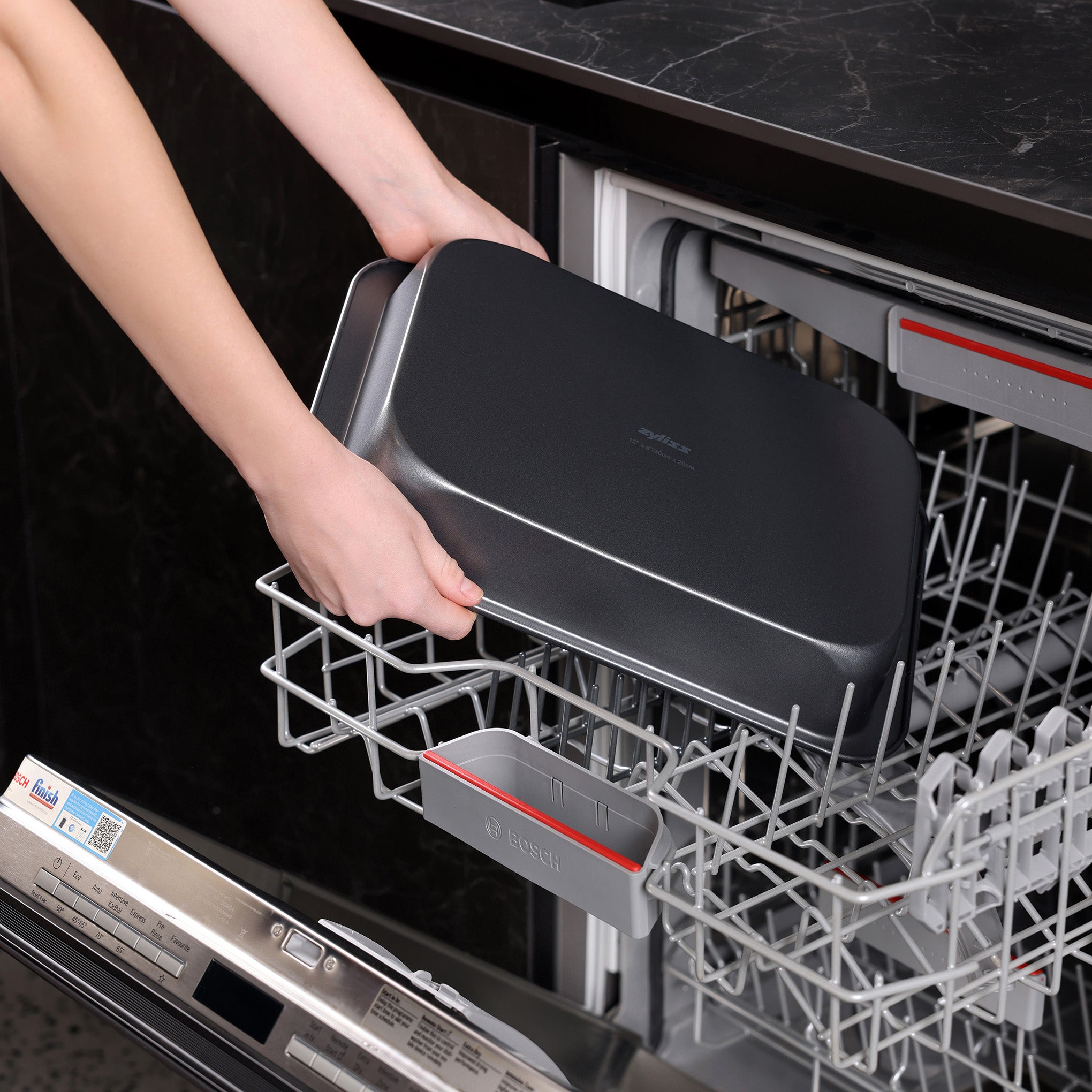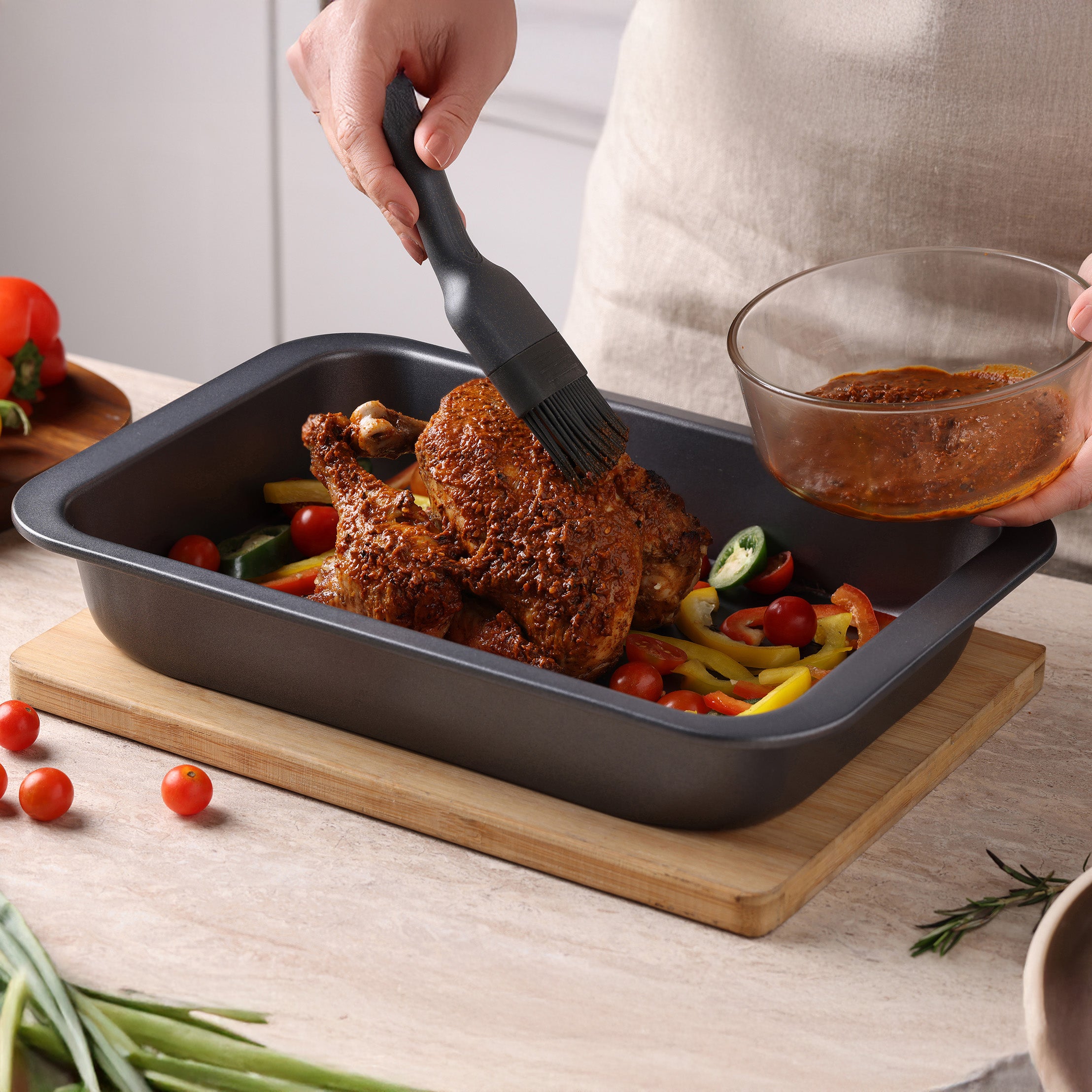 - Deep sides help contain juices, making it ideal for traybakes and roasting.