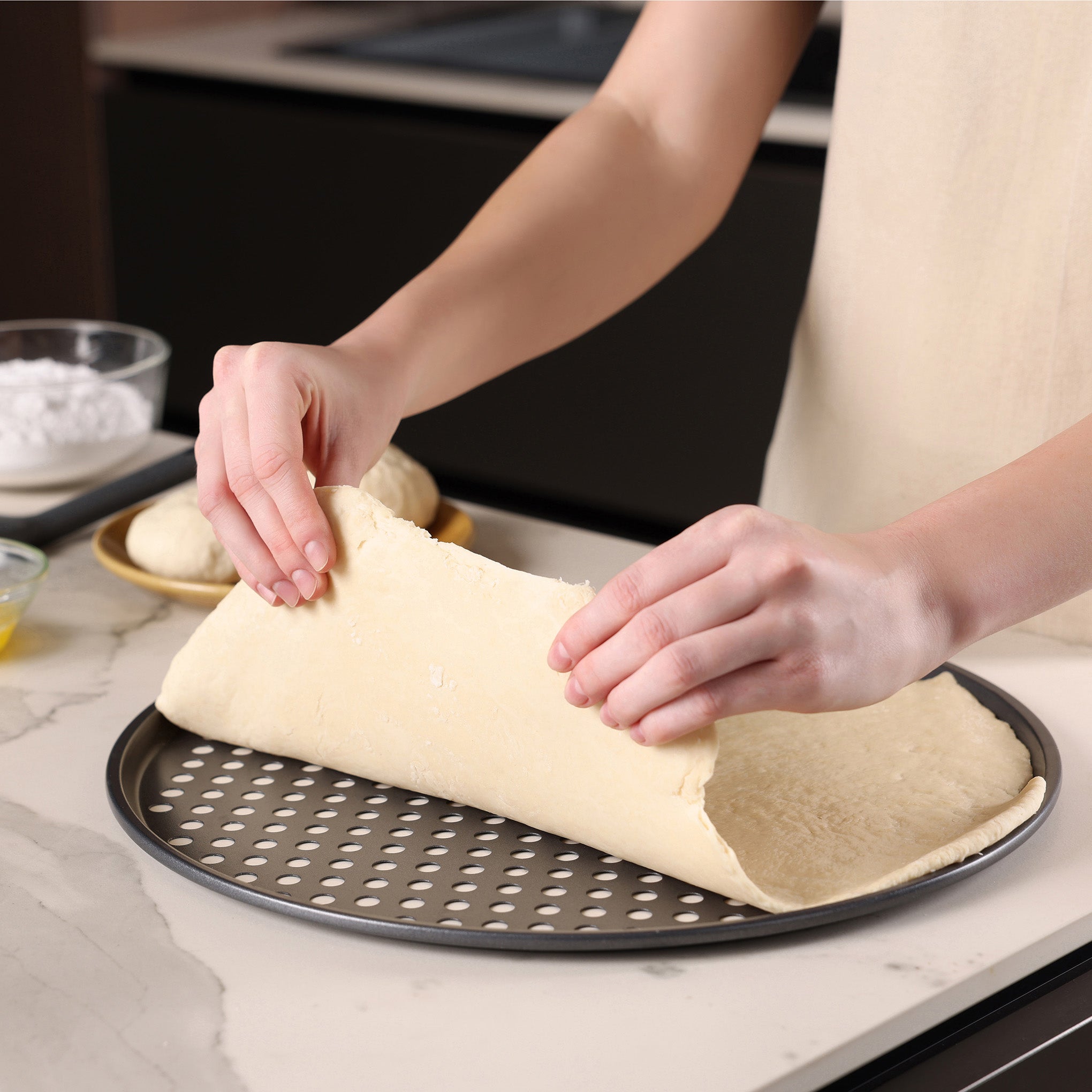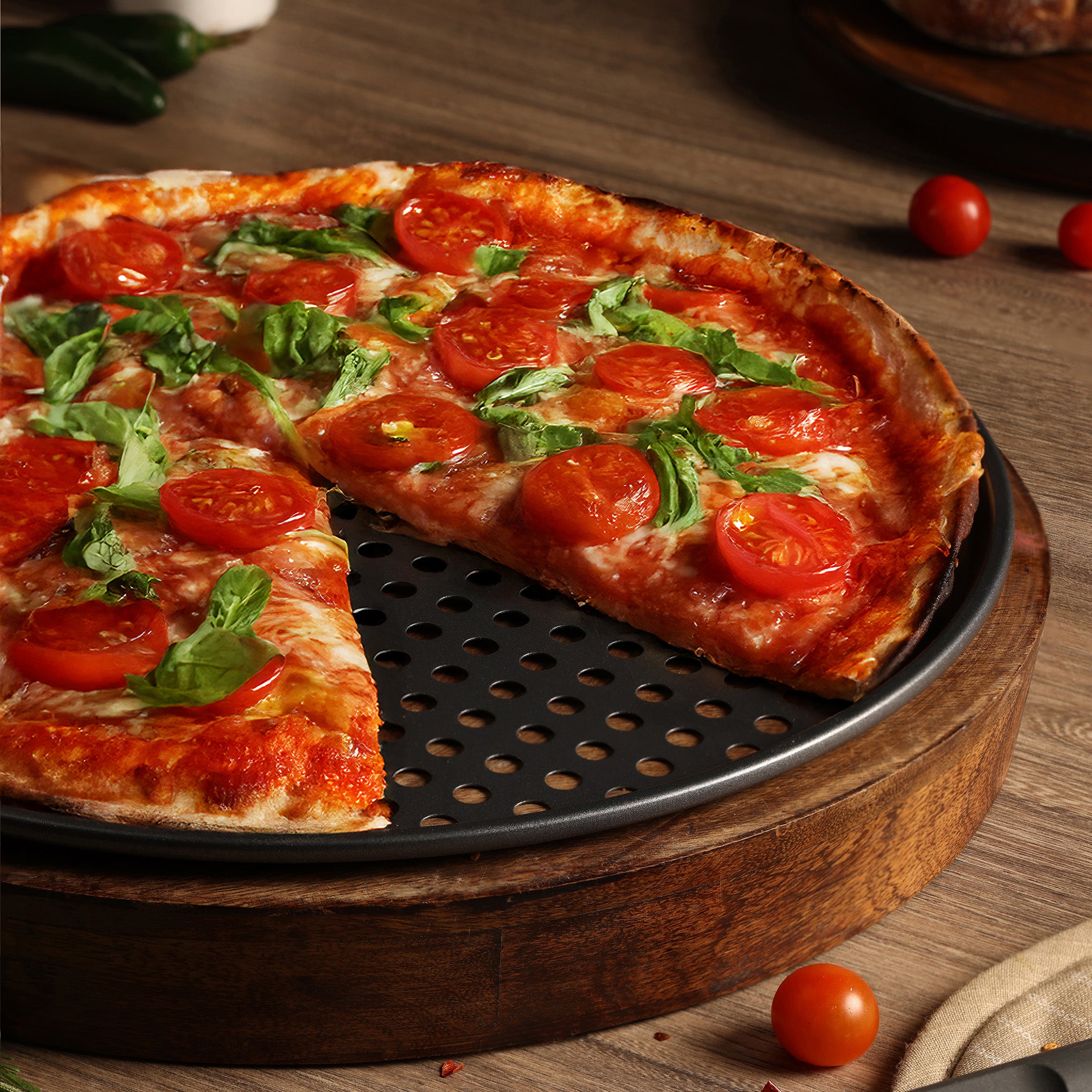 - Perforated base allows air circulation for crisp, evenly baked crusts.