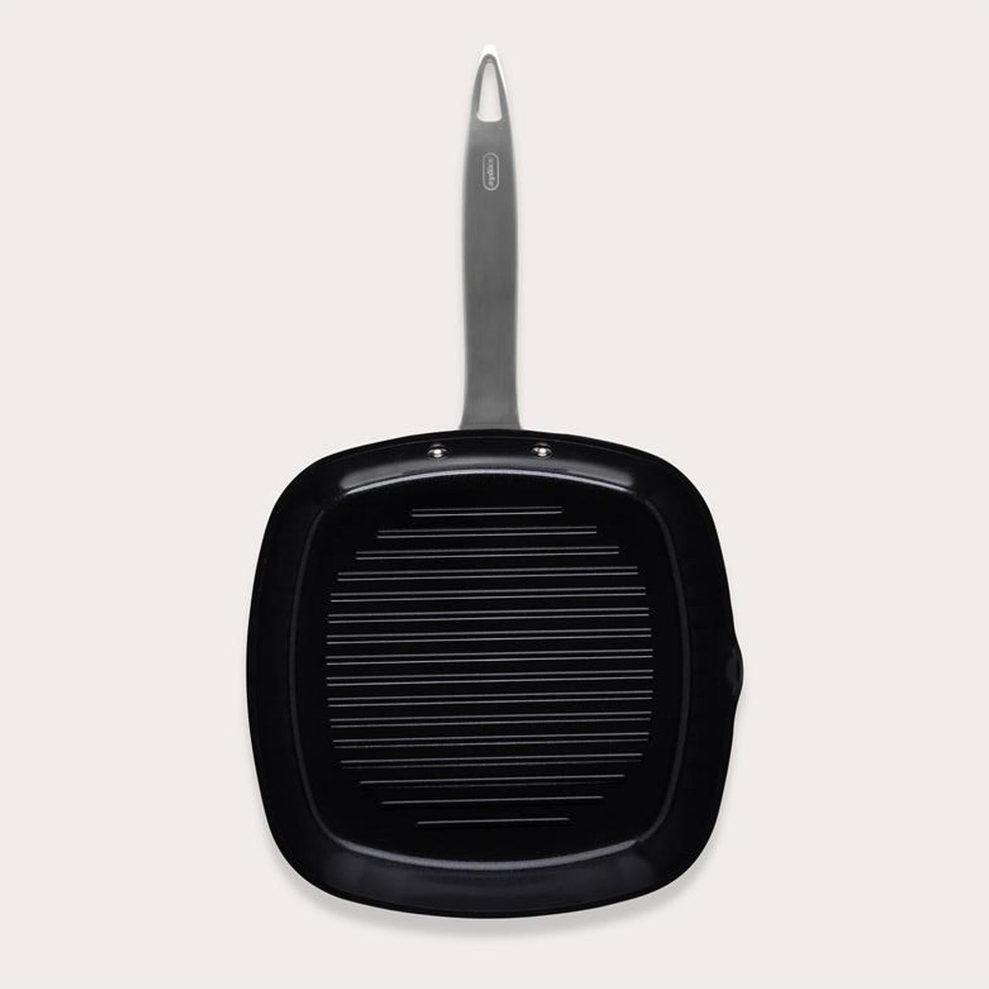 Master the art of grilling indoors with the Zyliss Ultimate Pro Ceramic Grill Pan. Achieve perfectly seared steaks, tender chicken, or char-grilled vegetables right in your kitchen. This 26cm / 10.25" pan features our toughest non-stick ceramic coating ever for effortless food release and easy cleanup, while the stainless steel base ensures rapid and even heating. Body made from recycled aluminium with a convenient pouring spout, and compatibility with all hobs, this grill pan is also food-safe, dishwasher, and oven-safe up to 220°C / 430°F. This versatile pan is perfect for grilling perfection all year round.